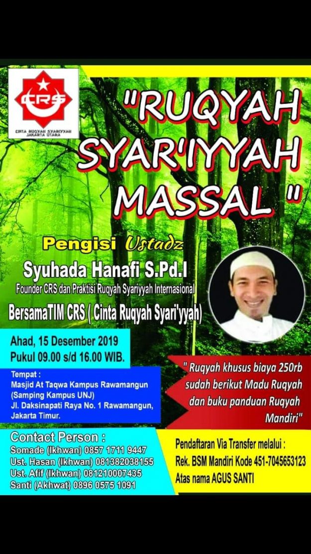 Assalamualaikum.. Bagi teman² yang memiliki keluhan seputar gangguan jin , sihir ain atau penyakit medis yg sulit di sembuhkan hadiri dan ikuti Ruqyah Massal bersama Yayasan Cinta Ruqyah , bertempat di Masjid Attaqwa UNJ ( Univ. Negeri Jakarta ). Pada hari : Ahad , 15 Des 2019 pukul :09:00WIB – selesai. Untuk informasi &…
