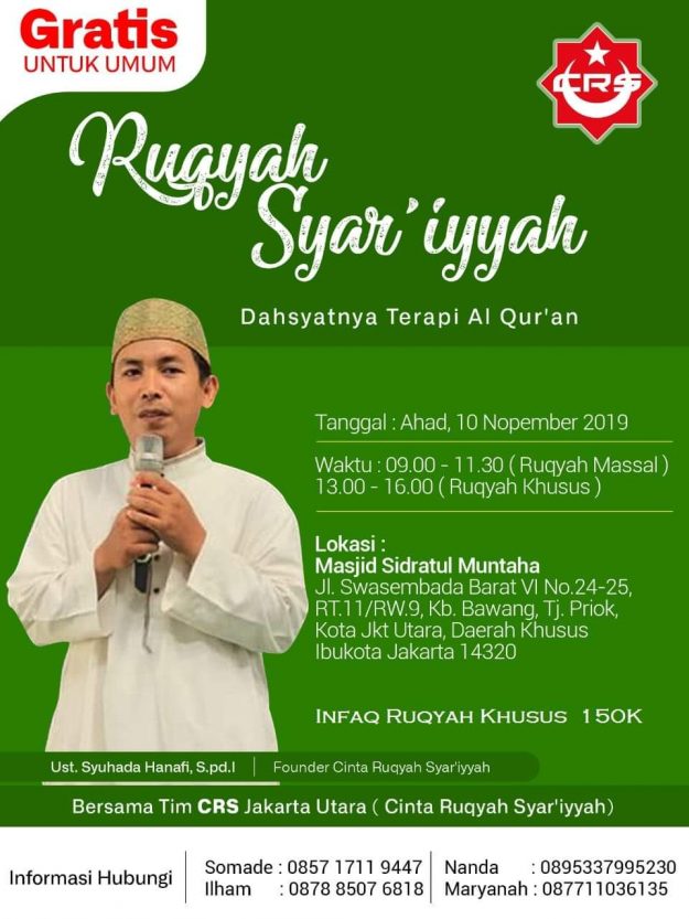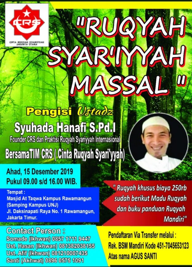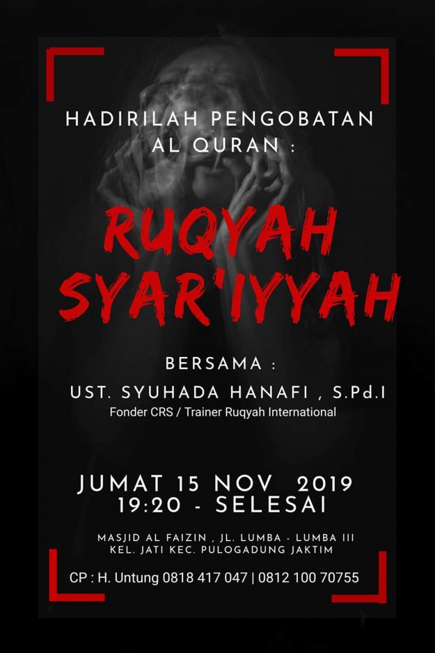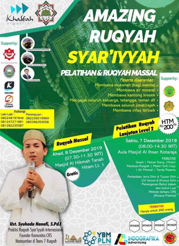 Yuk Geessss….. Ane mengundang teman2 semua untuk hadir dalam event One day Training Ruqyah Syar’iyyah dan Ruqyah Massal yg diselenggarakan oleh Khalifah Organizer 7-8 Desember 2019. Daftar segera training ruqyah syar’iyyah 2019 ” Mengupas seluk beluk sihir dan cara pengobatan yg benar ” Bersama ust. Syuhada Hanafi II, S.PdI Ada HTM Spesial untuk minggu ini…