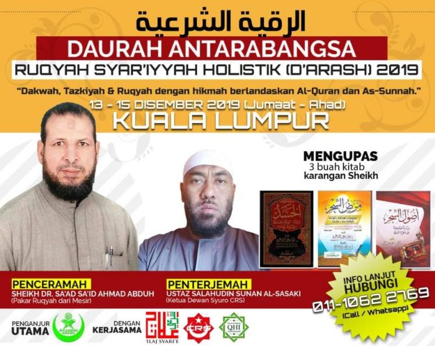 ” 🕌 *DAURAH ANTARABANGSA RUQYAH SYAR’IYYAH HOLISTIK (D’ARASH) 2019* 🕌 🗓 TARIKH: *13-15 Disember 2019 (Jumaat – Ahad)* ⏰ MASA: *9.00AM – 10.00PM* 🏫 LOKASI: *Kuala Lumpur.* Bersama Penceramah Utama: 💎 *SHEIKH DR. SA’AD SA’ID AHMAD ABDUH* – Pakar ruqyah drpd Mesir. Penterjemah: 💎 *USTAZ SALAHUDIN SUNAN AL-SASAKI* – Ketua Dewan Syuro CRS International –…