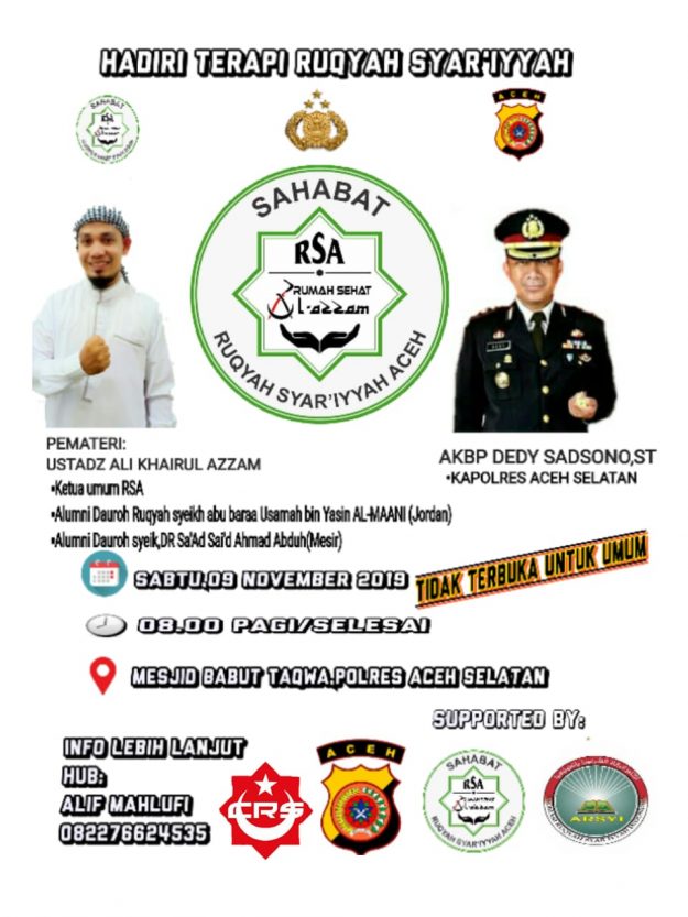 In sya Allah Kajian dan Terapi Ruqyah akan hadir Di Polres Aceh Selatan , bagi para anggota , yuk ikuti dan hadiri acara ini