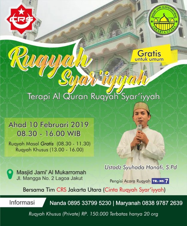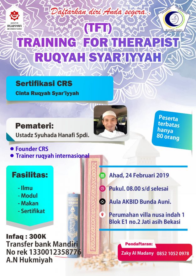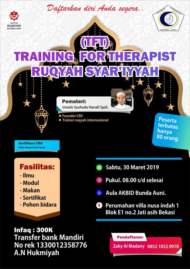 Kabar Gembira kembali di buka kesempatan Menjadi Praktisi Ruqyah , bagi anda Yg ingin mengenal Ruqyah lebih komprehensif berdasarkan Manhaj salaful ummah. TFP CRS 13 Akan mencetak anda Menjadi Praktisi Ruqyah Sejati , lulusan akan mendapatkan sertifikat Praktisi Resmi CRS (Cinta Ruqyah Syar’iyyah ) yg sudah teregistrasi Resmi di Kemhumham. Catat hari dan tanggalnya. :…