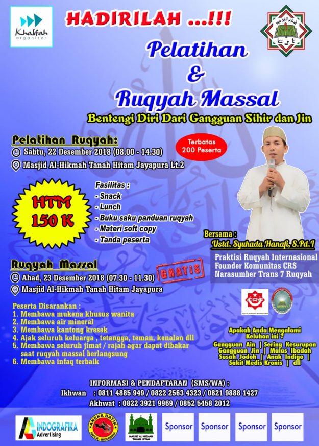 بسم الله الر حمن الر حيم السلام عليكم ورحمة الله وبركا ته Asosiasi Ruqyah Syariyyah Indonesia (ARSYI) Dpd Sukabumi Cinta Ruqyah Syariyyah (CRS) Sukabumi bekerjasama dengan RSUD Pelabuhan Ratu Sukabumi Ikuti dan Hadirilah KAJIAN DAN TERAPI QUR’ANI Berobat dengan Al-Qur’an dan Sunnah Materi ✅Tazqiyyatun Nafs ✅Muhasabah ✅Ruqyah Mandiri ✅Ruqyah Jama’i 👳🏻♂Bersama Ust. Asep Saepul Rohman…