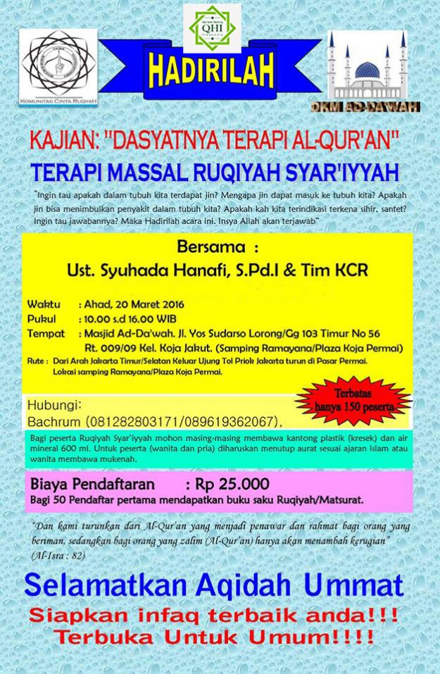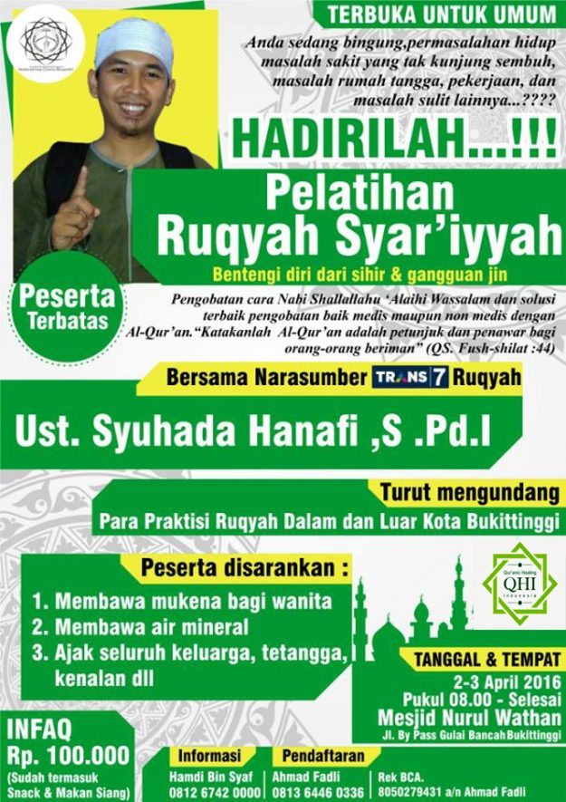 TERAPI Al- QURAN bersama USTADZ SYUHADA HANAFI Nara Sumber RUQYAH TRANS7. Bagi Teman – teman warga Fb yang memiliki saudara , kerabat yang mengalami keluhan seputar gangguan Jin / Sihir /santet , atau penyakit yang tak kunjung sembuh Yuk ikuti : PELATIHAN,TERAPI & RUQYAH MASSAL Ahad, 24 April 2016 Pukul 08.00-16.00 WIB Masjid…