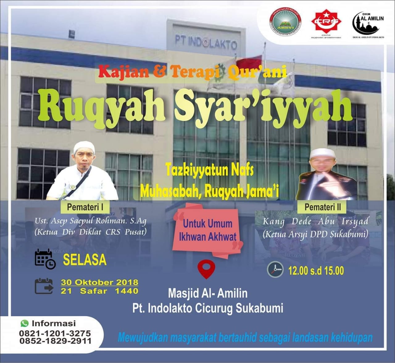 Cinta Ruqyah Foundation Bekerjasama dengan Dkm Al amin PT. Indolakto mempersembahkan untuk anda , sebuah Event Akbar Untuk Umat..