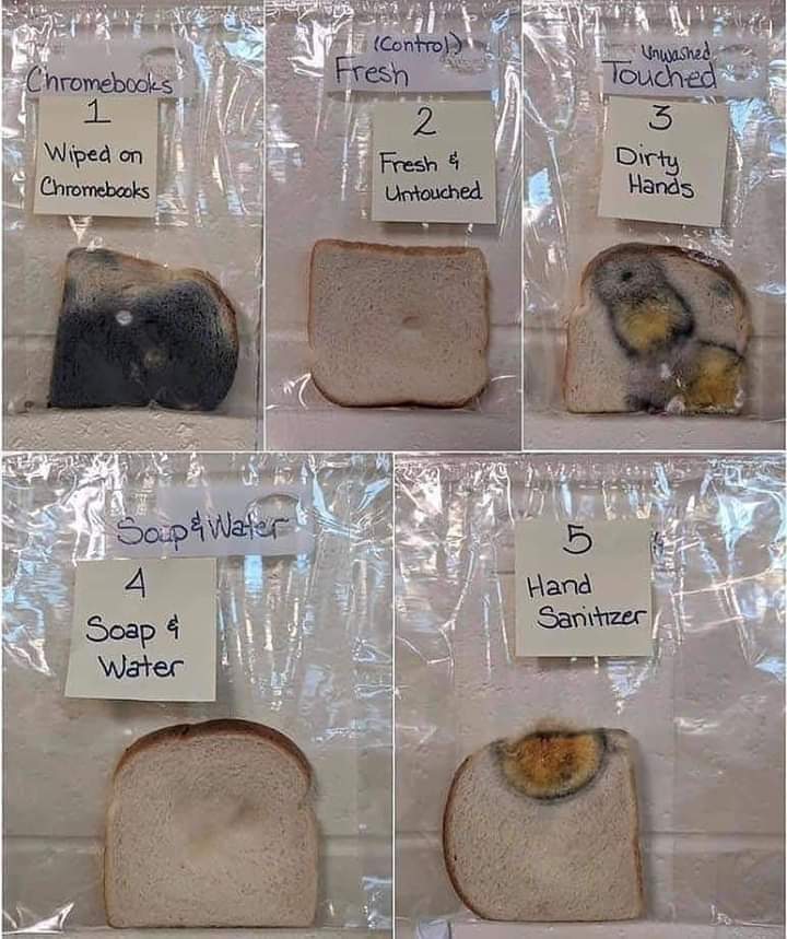 5️⃣ Roti tawar kelima disentuh oleh anak-anak yang menggunakan hand sanitizer (pembersih tangan alkohol) .
